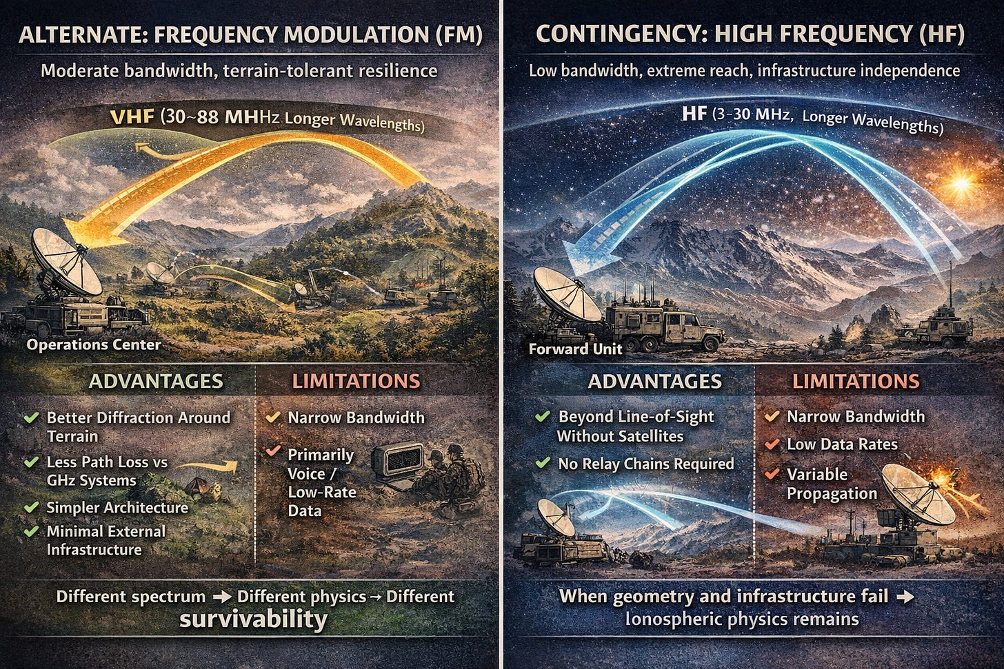Each layer hedges against a different category of failure. UTI collapses under orbital denial or network disruption. FM survives those failures but struggles with severe terrain masking. HF survives terrain masking but is vulnerable to atmospheric variability and offers little throughput. JBC-P survives most of the above by demanding almost nothing from the network.