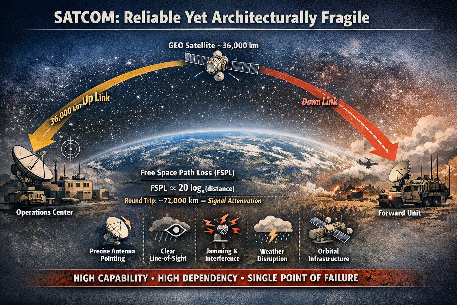 These physics realities translate directly into operational constraints. SATCOM requires precise antenna pointing, a clear line-of-sight to space, and sufficient link margin to overcome interference. At higher frequency bands, performance becomes increasingly sensitive to atmospheric effects such as rain fade. All of this exists alongside a critical dependency on orbital infrastructure.