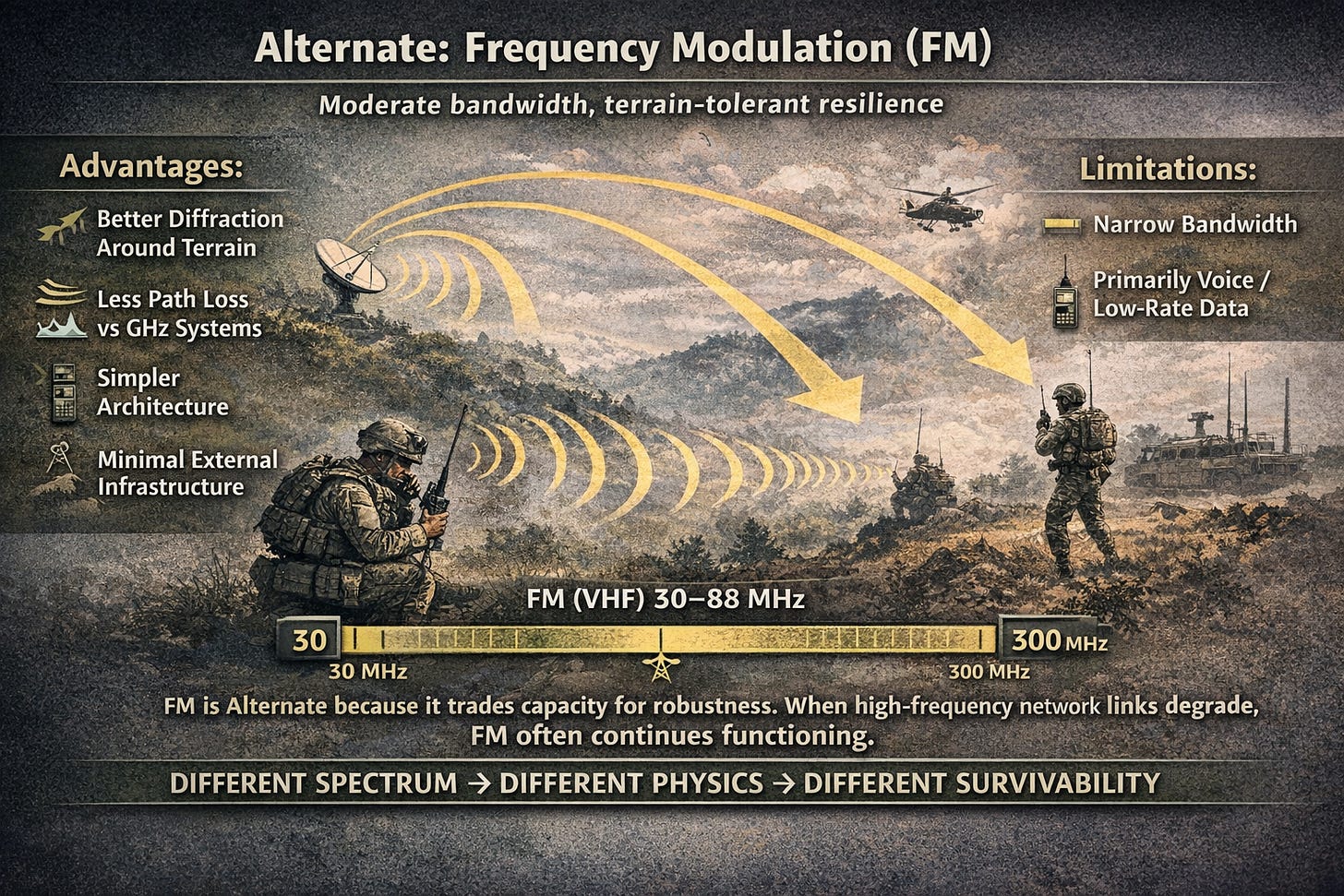 FM is selected as the Alternate layer in a PACE plan precisely because of this trade-off. It does not compete with Upper Tactical Internet in bandwidth or speed, but it often survives conditions that degrade high-frequency systems. When line-of-sight links are masked, networks are disrupted, or SATCOM access becomes unreliable, FM frequently continues to function.
